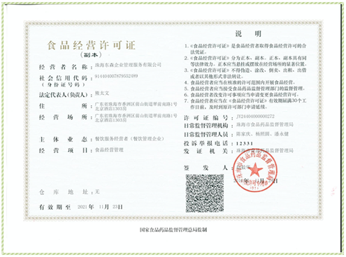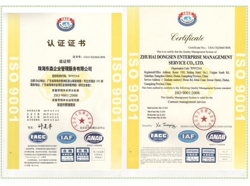 珠海东森企业管理服务有限公司成立时间2003年4月25日,法定代表人熊太文。公司是1997年涉足配餐管理服务的公司。本公司集食堂管理,营养配餐,特色餐饮,酒楼餐饮为一体,率先通过ISO9001:2008、HACCP认证(国际食品安全管理体系认证)的餐饮连锁企业。公司开创了“餐饮责任保险”的先河,为用餐者购买了《餐饮场所责任保险》,最高赔付额200万元。